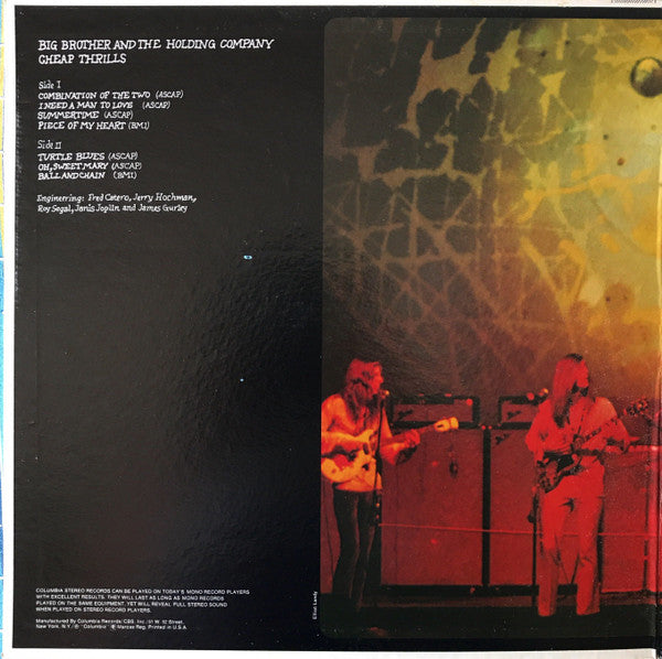 Manufactured by Columbia Records / CBS, Inc. / 51 W. 52 Street, New York, N.Y. Printed in U.S.A. Live material recorded at Bill Graham's Fillmore Auditorium. Approved By Hell's Angels Frisco. Photo on back cover of Janis Joplin: © Thomas Weir 1967 This is an undisclosed pressing without barcode. For pressings without barcode where the runouts contain relevant information about the manufacturing process, see: [r14176337, [r10084564, [r14799339, [r8318736, [r15654922.