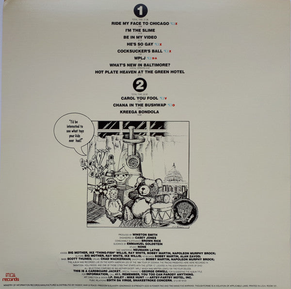 This album contains material which we deem unfit for exposure to humans and unborn fetus. This album was recorded live on the North American leg of the 1984 tour of Oceania. The tracks presented here were recorded in Saratoga, Hollywood, and one of those cities that starts with the letter "C" located in the god-forsaken state of Ohio. Consumable sustenance: Brown Rice Disc mastering: Neumann Lathe Pubic Relations: Edith Da Virge / Snakestroke Concern (212) 807-8123 Special thanks to George Orwell for suggesting the album title. Ministry Of Information Records Manufactured & distributed by INGSOC. War is peace. Freedom is slavery. Ignorance is strength. God is power. Two and two make five.