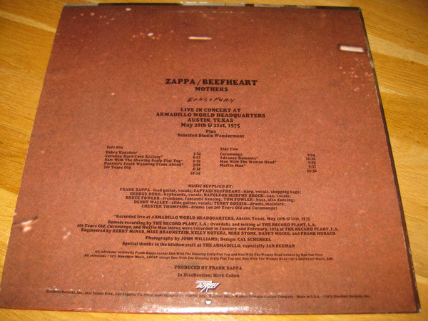 Tracks A1 to A4, B2 to B4: "Recorded live at Armadillo World Headquarters, Austin Texas, May 20th and 21st, 1975. Plus Selected Studio Wonderment." A5, B1 & B4 intros recorded Jan & Feb 1974, remote recording, overdubs & mixing at The Record Plant, L.A.