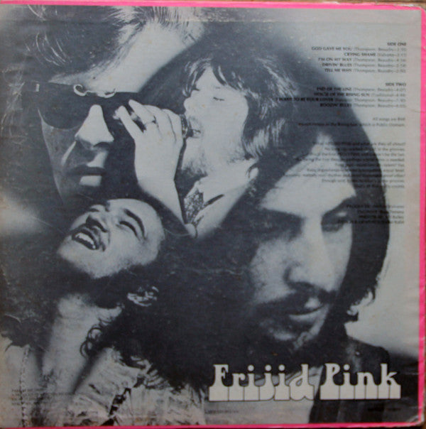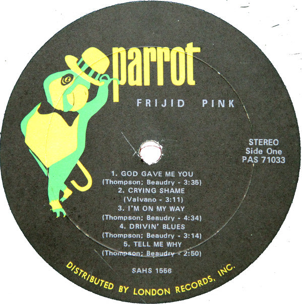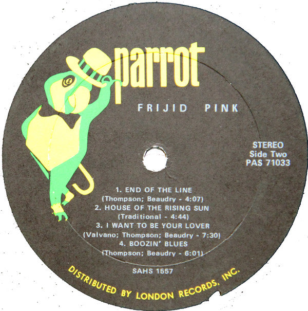 Label Variation: Very similar to [r5081982, except FRIJID PINK letter/fonts are spaced further apart and font on other printing is s bit smaller. All songs are BMI except "House Of The Rising Sun" which is Public Domain. Track B2: sleeve credits Traditional, label credits Price. Parrot Records A Product of London Records, Inc. New York, N.Y. 10001 Printed in U.S.A.
