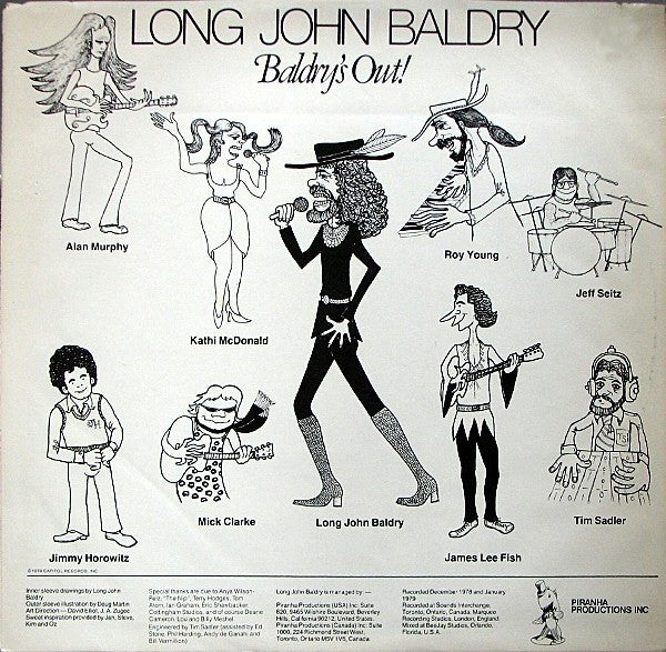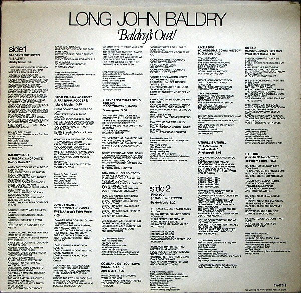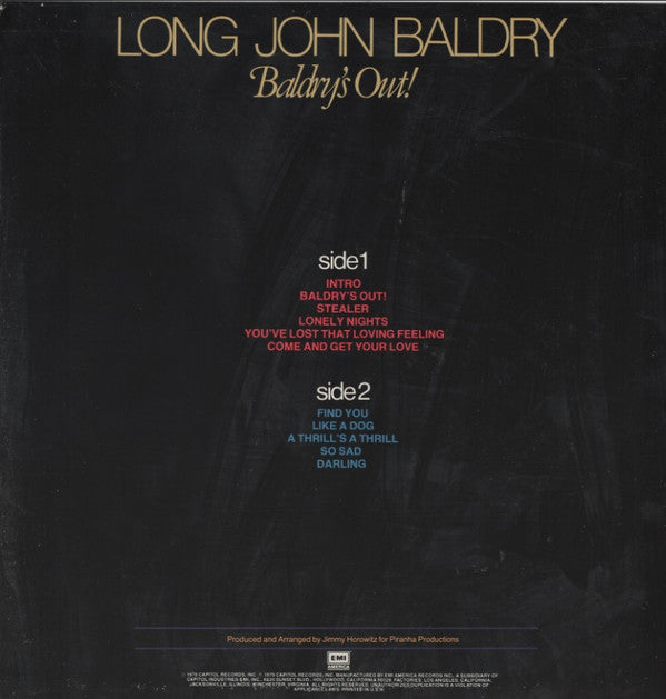 © 1979 Capitol Records, Inc. ℗ 1979 Capitol Records, Inc. Manufactured by EMI America Records Inc., A Subsidiary Of Capitol Industries-EMI, Inc. Printed in U.S.A. Produced for Piranha Productions Recorded December 1978 and January 1979 Recorded at Sounds Interchange, Toronto, Ontario, Canada. Marquee Recording Studios, London, England. Mixed at BeeJay Studios, Orlando, Florida, U.S.A. Sweet inspiration provided by Jan, Steve, Kim and Oz. Inner sleeve includes lyrics. "Baldry's Out! Intro." appears on label and inner sleeve, "Intro" appears on back of sleeve. "The Stealer" appears on label, "Stealer" appears on inner sleeve & back of sleeve. "You've Lost That Lovin' Feelin'" appears on label, "You've Lost That Loving Feeling" appears on inner sleeve & back of sleeve. "So Sad (When You Need Some And There's None)" appears on label, "So Sad" appears on inner sleeve and back of sleeve. A1, A2, B1 - Baldry Music A3 - Island Music A4 - Aesop's Fable Music A5 -Screengems A6 - April Music B2 - H.G. Music B3 - Sparkle Music/Unichappell B4 - Have More Want More Music B6 - copyright control