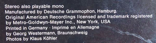 Metro Records ® Stereo also playable mono Manufactured by Deutsche Grammophon, Hamburg. Original American Recordings licensed and trademark registered by Metro-Goldwyn-Mayer., New York, USA Printed in Germany - Imprimé en Allemagne by George Westermann, Braunschweig