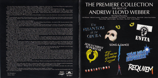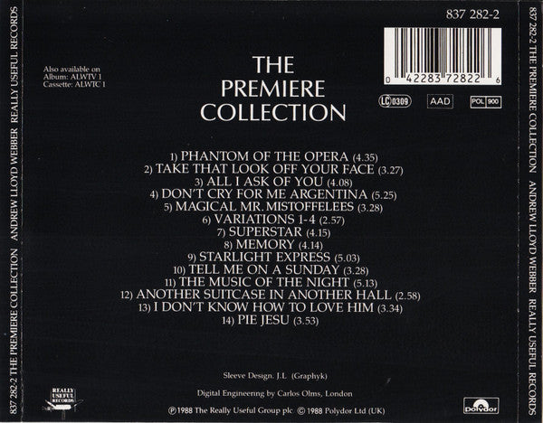Issued with aN 8 Page Booklet Backcover: ℗ 1988 The Really Useful Group plc. © 1988 Polydor Ltd. (UK) AAD Also Available on: Album: [r2509295 ALWTV 1 Cassette: [r7009893 ALWTC 1 Booklet: Publisher: 1: The Really Useful Group Co. Ltd. 2: The Really Useful Group Co. Ltd./ Dick James Music Ltd. 3: The Really Useful Group Co. Ltd. 4: Evita Music Ltd. 5: The Really Useful Group Co. Ltd./ Faber Music Ltd. 6: Steam Power Music Ltd. 7: MCA Music Ltd. 8: The Really Useful Group Co. Ltd./ Faber Music Ltd. 9: The Really Useful Group Co. Ltd. 10: The Really Useful Group Co. Ltd./ Dick James Music Ltd. 11: The Really Useful Group Co. Ltd. 12: Evita Music Ltd. 13: MCA Music Ltd. 14: The Really Useful Group Co. Ltd. 1: ℗ 1986 The Really Useful Group Co. Ltd. 2: ℗ 1980 The Really Useful Group Co. Ltd. 3: ℗ 1987 The Really Useful Group Co. Ltd. 4: ℗ 1976 MCA Records Inc. 5: ℗ 1980 The Really Useful Group Co. Ltd. 6: ℗ 1978 MCA Records Inc. 7: ℗ 1970 MCA Records Inc. 8: ℗ 1981 The Really Useful Group Co. Ltd. 9: ℗ 1984 The Really Useful Group Co. Ltd. 10: ℗ 1980 The Really Useful Group Co. Ltd. 11: ℗ 1986 The Really Useful Group Co. Ltd. 12: ℗ 1976 MCA Records Inc. 13: ℗ 1970 MCA Records Inc. 14: ℗ 1985 The Really Useful Group Co. Ltd. 4: Licensed from MCA Records Inc. 6: Licensed from MCA Records Inc. 7: Licensed from MCA Records Inc. 12: Licensed from MCA Records Inc. 13: Licensed from MCA Records Inc. 14: Licensed from EMI Ltd. ℗ 1988 The Really Useful Group plc. © 1988 Polydor Ltd (UK) Coverspine: 837 282-2 The Premiere Collection Andrew Lloyd Webber Really Useful Records CD: ℗ 1988 The Really Useful Group plc. © 1988 Polydor Ltd (UK) This version probably the original European pressing as it states W. Germany in matrix. The disc is also engraved/printed with mini CDs all round the top surface.