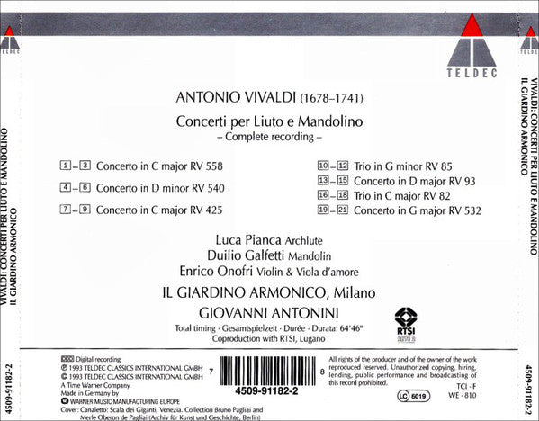 ⓅⒸ 1993 Teldec Classics International GmbH. A Time Warner Company. Coproduction with RTSI, Lugano (RETE 2). Total timing: 64'46". Stereo. Recording location: Studio 1 RTSI ∙ December 1990 (RV 93), April / May 1992 Made in Germany by Warner Music Manufacturing Europe. Cover: Canaletto: Scala dei Giganti, Venezia. Collection Bruno Pagliai and Merle Oberon de Pagliai (AKG, Berlin). The 40-page glossy booklet contains notes in English, German, French and Italian plus a track and credits-list. Booklet and CD are stored in a standard jewel case with black tray.