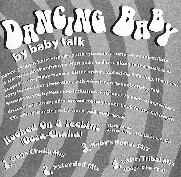 Recording & Production: Hard House Productions ℗&© 1998 Peter Pan Records/ASCAP. Manufactured & Distributed by PPI Entertainment Group, a Division of Peter Pan Industries, Inc. Newark, NJ. © Copyright 1998 Unreal Pictures, Inc./Autodesk, Inc. Screen Gems - EMI Music Inc. BMI From the upcoming album "Dancing Baby" on Peter Pan Records. Multi-Image™ CD Case by Gelardi Design. Multi-Image is a trademark of Gelardi Design & Development, Kennebunkport, Maine and is produced under license from Insight, Inc. (Special CD case design creates image of baby dancing on front cover when the case is moved.) Special thanks to Eric Henry, LOGOTEL, Inc. Hooked On A Feeling (Ooga-Chaka) (Latin/Tribal Mix) (Ooga Cha-Cha) appears on back inlay, Hooked On A Feeling (Ooga-Chaka) (Latin/Tribal Mix) (Ooga-Cha Cha) appears inside inlay. Duration times do not appear on release.