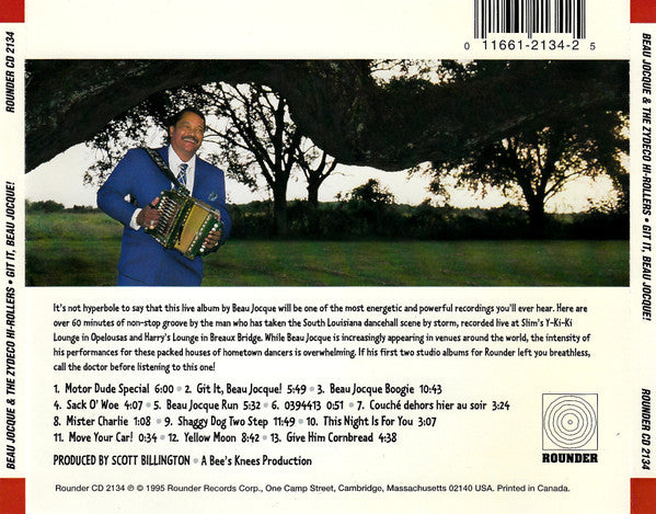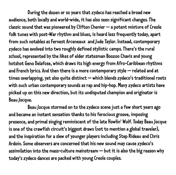 Packaged in a standard jewel case with black tray. Issued with a 8-panel fold-out booklet. Recorded live in the Big Mo Mobile Recording Truck, at Harry's Lounge, Breaux Bridge Louisiana (September 13, 1994), at Slim's Y-Ki-Ki Lounge, Opelousas, Louisiana (September 14, 1994). Mixed at Ultrasonic Studios, New Orleans, Louisiana. Originally mastered at Sterling Sound, New York. Published by Beau Jocque Music-Happy Valley Music, BMI, except tracks 1 & 9: Flat Town Music, BMI; track 4: Copyright Control; track 8: Sanga Music, BMI; track 12: Apache Red Music-Neville Music, BMI. ℗ © 1995 Rounder Records Corp. Printed in Canada Manufactured in USA