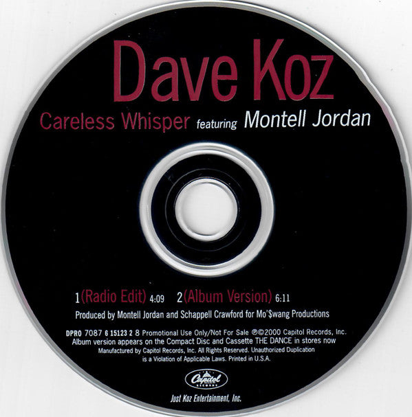 Dave Koz Featuring Montell Jordan - Careless Whisper (CD, Single, Promo) (NM or M-)