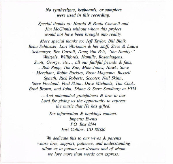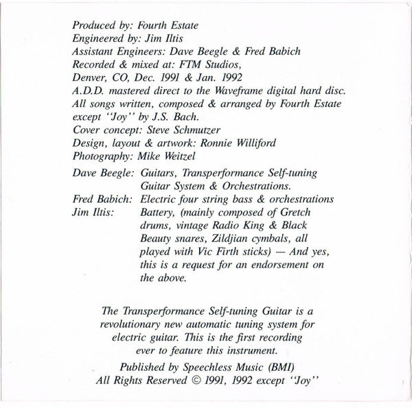 This is the Red faced with black print earliest known CD pressing. It has 1991 and 1992 copyrights on the cd face as well as being listed as Speechless Music. 1991 and 1992 are also both referenced in the liner notes on the bottom of the first page. In the first page credits it has recording and mixing stated as having been Dec. 1991 & Jan. 1992 which differs from later releases that drop the December reference. On the second page credits in the "More special thanks to:" liner notes, Morris Beegle is missing from this release and added in later releases. RR 28-3-28 is the catalog number on the CD back tray card edges. The CD case edges of the tray card with titles are inverted and corrected on later releases. 70001 is on the face of the CD. Additional Liner Note: No synthesizers, keyboards, or samplers were used in this recording.