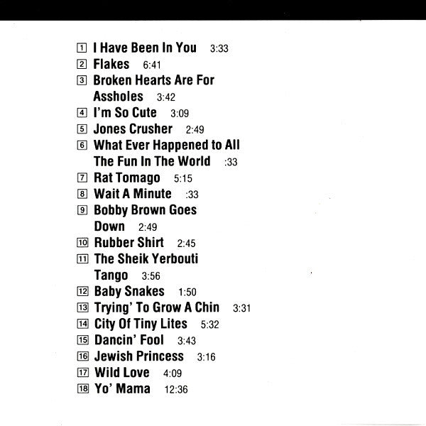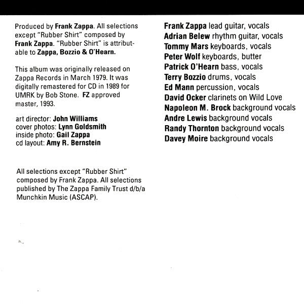 Charakteristics: - Green Tinted Jewel Case - Rykodisc OBI - Fold Out 19-page Cover Booklet - 10-page Rykodisc Fold Out Catalog This album was originally released on Zappa records in March 1979. It was digitally remastered for CD in 1989 for URMK. FZ approved master, 1993. Track 1 - basic track recorded live at the Odeon Hammersmith, London. Over-dubs: lots of 'em. Track 2 - basic track recorded live at the Odeon Hammersmith, London. Over-dubs: lots. Track 3 - basic track recorded live at the Odeon Hammersmith, London. Over-dubs: lots. Track 4 - basic track recorded live at the Odeon Hammersmith, London. Over-dubs: lots. Track 5 - basic track recorded at the palladium, NYC. Over-dubs: feedback guitar. Track 7 - live instrumental recorded at the Deutschland Halle, Berlin. Over-dubs: none. Track 8 - titled "We've Got To Get Into Something Real" in the booklet. Track 9 - basic track recorded live at the Odeon Hammersmith, London. Over-dubs: lots. Track 10 - Special Note: the bass part is extracted froma four track master of a performance from Goteburg, Sweden 1974 which i had Patrick O'Hearn overdub on a medium tempo guitar solo track in 4/4. The noted chosen were more or less specified during the overdub session, and so it was not completely an improvised "bass solo". A year and a half later, the bass track was peeled off the Swedish master and transferred to one track of another studio 24 track master for a slow song in 11/4. The result of this experimental re-synchronization (the same technique was used on the Zoot Allures album in "Friendly Little Finger") is the piece you are listening to. All of the sensitive, interesting interplay between the bass and drums never actually happened...also note, the guitar solo section of the song "Yo' Mama" was done the same way. Track 11 - basic track recorded live at Deutschland Halle, Berlin. Over-dubs: none. Note: This selection and "Rat Tomago" were recorded on a portable four track Scully. The sound quality is not as clear as other parts of the album, but what the fuck... Track 12 - basic track recorded live at the Odeon Hammersmith, London. Over-dubs: lots. Track 13 - basic track recorded live at the Odeon Hammersmith, London. Over-dubs: a few. Track 14 - titled "City Of Tiny Lights" in the booklet. basic track recorded live at the Odeon Hammersmith, London. Over-dubs: a few. Track 15 - basic track recorded live at the Odeon Hammersmith, London. Over-dubs: lots. Track 16 - basic track recorded live at the Palladium, NYC. Over-dubs: lots. Track 17 - basic track recorded live at the Odeon Hammersmith, London. Over-dubs: lots. Track 18 - basic track for vocal sections and middle of guitar solo were recorded live at the Odeon Hammersmith, London; guitar solo is from a four track recording made in some little town outside of Nurnberg that i can't remember the name of. Over-dubs: lots. All selections published by The Zappa Family Trust d/b/a Munchkin Music (ASCAP). All lyrics © 1979 The Zappa Family Trust d/b/a Munchkin Music (ASCAP). Reprinted by permission. All Rights reserved. Artwork copyright © 1995 The Zappa Family Trust. FZ, ZAPPA, and Frank Zappa are marks belonging to The Zappa Family Trust. All Rights Reserved. ℗ 1979, 1990 Rykodisc. All rights reserved. © 1979, 1995 The Zappa Family Trust. Reproduced under license.
