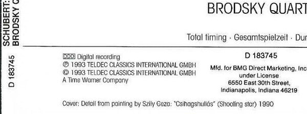 Total timing 67:21 Recording location: TELDEC Studio, Berlin · May (Crumb), June (Schubert) 1992 Publishers: Schubert: Bärenreiter © 1989 Crumb: Edition Peters © 1971 Edition Peters ℗ 1993 Teldec Classics International, GmbH © 1993 Teldec Classics International, GmbH Mfd. for BMG Direct Marketing, Inc. under License CD is packaged in a standard plastic black-tray jewel case along with a 16-pages booklet, notes in English. This release has no barcode on packaging.