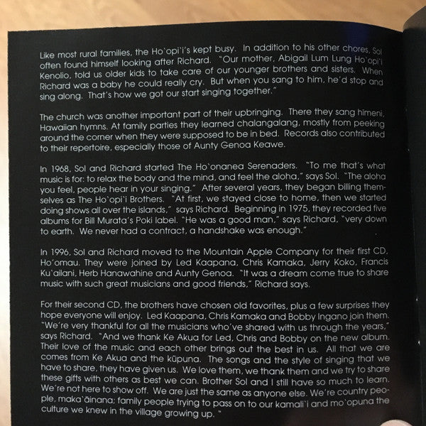Error on tray insert spine: "Hoopi Brothers" The Mountain Apple Company PO Box 22373 Honolulu, Hawai‘i 96723 www.mountainapplecompany.com Recorded at the Mountain Apple Studios, Hawai‘i. Mastered at John Golden Mastering, California. Graphic layout: Adam's Apple Graphic Design