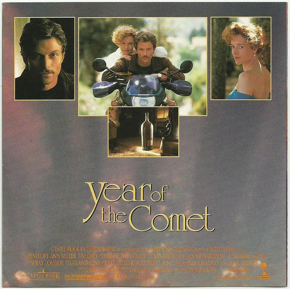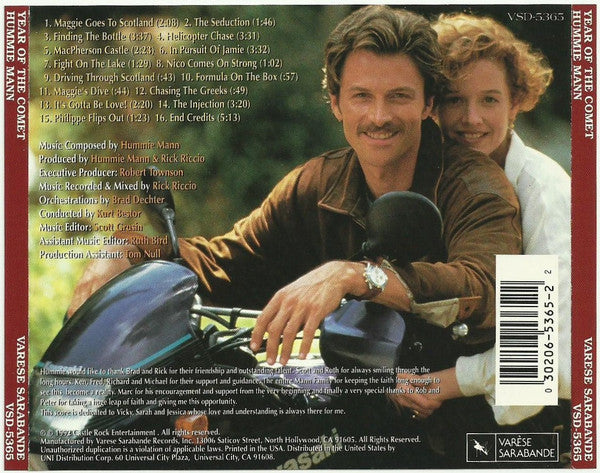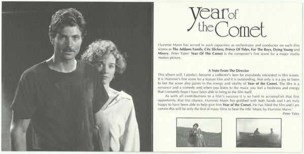 1992 Varèse Sarabande U.S. CD issue of the original motion picture soundtrack to "Year of the Comet," composed by Hummie Mann and performed by an unidentified studio orchestra under the baton of Kurt Bestor. The packaging features a four-page booklet with a brief uncredited biographical note for the composer, liner notes from film director Peter Yates (9), and three black-and-white photos from the film on the interior pages; and color front and back covers, the former featuring key art from the production, and the latter featuring both film production credits and color photos from the production. (The inlay card also incudes a long list of "Special Thanks," which, due to space limitations, will not be included here!)