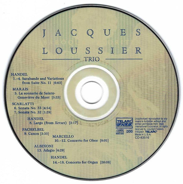 Jazz improvisations on Baroque Favorites All selections arranged and published by Jacques Loussier (SACEM) Recorded At Studio Grande Armee,Palais Des Congres,Paris, France June 4-21,2001. CD states "Made in U.S.A.". All text is in English ℗ © 2001 Telarc Total Playing Time: 58:10