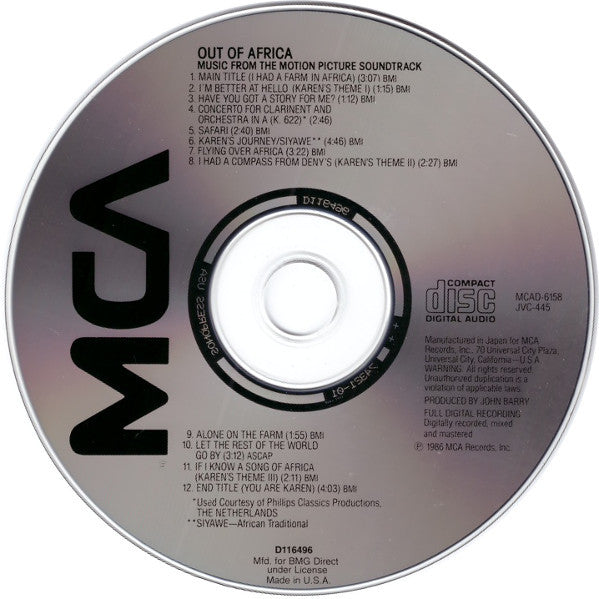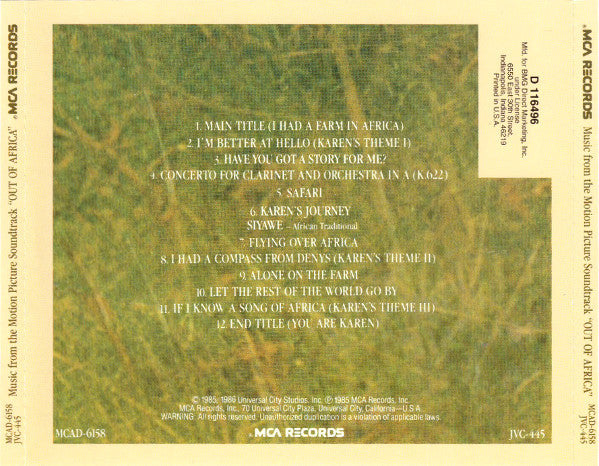 Manufactured in the U.S.A for MCA Records, Inc. Full digital recording - Digitally recorded, mixed and mastered. Recorded at The Record Plant, Studio M. On back cover and rear insert: © 1985, 1986 Universal City Studios, Inc. ℗ 1985 MCA Records, Inc. On disc: ℗ 1986 MCA Records, Inc. While the text on the disc is identical to that of initial Japan-for-US copies (stating "Manufactured in Japan..."), this is a much later US-made Sonopress copy for BMG Music Service. The club catalog number is rendered with no spaces on the disc.