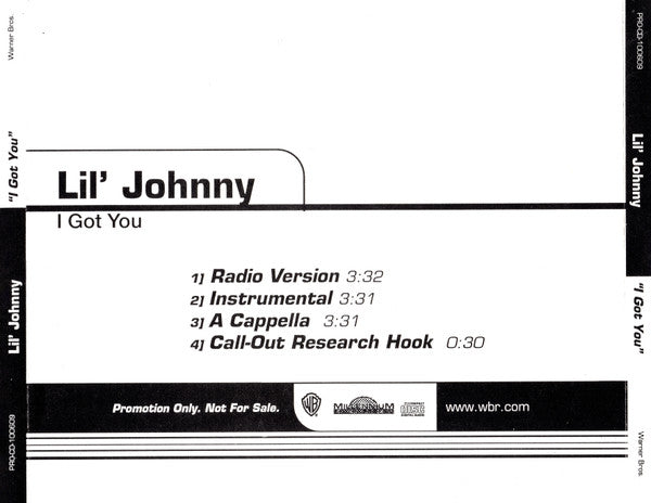 Original version from the Warner Bros. album I Got You (4/2-47967) Produced by [... for So So Def Productions, Inc. Co-Produced by [... for Blackbaby, Inc./Noontime Music, Inc. EMI April Music Inc. ASCAP / So So Def Music / Baby Boys Little Publishing Company / Noontime South SESAC [Sticker on jewel case Lil' Johnny The debut single “I Got You” Produced by hit maker Jermaine Dupri Check for Lil' Johnny on tour with Lil' Bow Wow / April 2001 PRO-CD-100609 Promotion only. Not for sale. ℗ 2001 Warner Bros. Records Inc. , a Time Warner Company. Mfg. by WEA Manufacturing. Made in USA