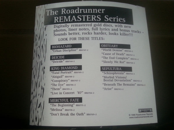 Comes in a normal jewelcase with a 8-paged booklet and a leaflet with information about The Roadrunner REMASTERS Series. Allthough the information of the leaflet says bonus tracks, this album has the original tracklist. Booklet contains liner notes, photos, information and lyrics. Digitally remastered on a gold disc at the Hit Factory, New York, NY . The Roadrunner Remasters Series as found on the leaflet. The Mercyful Fate Remasters as found on the golden sticker. [l34268 is a registered trademark of [l102160 Distributed in the U.S. by RED. Distributed in Canada by Attic. All songs published by Roadblock Music, Inc. (ASCAP) / Roadster Music B.V. ℗ 1983,1997 The All Blacks B.V. © 1983,1997 The All Blacks B.V. © 1998 Roadrunner Records Made In The U.S.A.