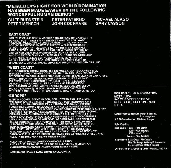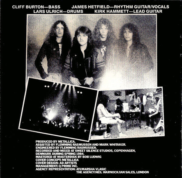 [Back Cover / Back of Booklet ℗ ©1984 Elektra/Asylum Records, 75 Rockefeller Plaza, New York, New York 10019, 9229 Sunset Boulevard, Los Angeles, California 90069/A Division of Warner Communications.,Inc., [warner logo Printed in U.S.A. [Inside Booklet (Early USA pressing with Oregon Fan Club Address) For fan club information Metallica 345 W. Riverside Drive Roseburg, Oregon 97470 U.S.A. Recorded and mixed at Sweet Silence Studios, Copenhagen, Denmark, during spring 1984. All songs published by Creeping Death Music, ASCAP. Lyrics © 1984 Creeping Death Music, ASCAP Label Catalogue#-1 9 60396-2 (Spine) Label Catalogue#-2 60396-2 (Disc, back cover & back of booklet) Track 5 duration indicated as 4:03 on disc & back cover, 4:30 in the booklet.