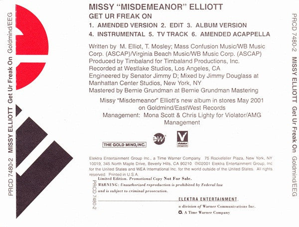 Missy “Misdemeanor” Elliott’s new album in stores May 2001 on Goldmind/EastWest Records Produced [... for Timbaland Productions, Inc. Mass Confusion Music/WB Music Corp. (ASCAP)/Virginia Beach Music/WB Music Corp. (ASCAP) Recorded at Westlake Studios, Los Angeles, CA Mixed at Manhattan Center Studios, New York, NY Mastered at Bernie Grundman Mastering Elektra Entertainment Group Inc., a Time Warner Company. 75 Rockefeller Plaza, New York, NY 10019, 345 North Maple Drive, Beverly Hills, CA 90210 ℗©2001 Elektra Entertainment Group Inc. for the United States and WEA International Inc. for the world outside of the United States. Printed in U.S.A.