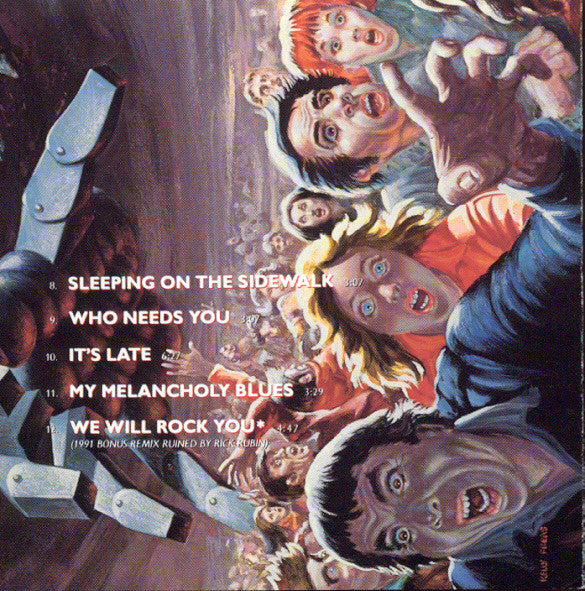 Standard jewel case with an 8-panel foldout booklet. Originally released in 1977. Track 12 is a newly-commissioned bonus remix; the "Ruined By Rick Rubin" subtitle is present on the packaging and disc label. No Mastering SID code. No Mould SID code. White Hollywood Records logo on tray card. The printed durations for Tracks 11 and 12 differ from their actual durations by more than five seconds. These printed durations are as follows: Track 11 3:29 Track 12 4:47 [Booklet Digitally remastered at The Town House, London Lyrics © 1977 Queen Music Ltd. ℗ & © 1977 & 1991 Original Sound Recordings made by Queen Productions Ltd. Under exclusive license to Hollywood Records. Distributed by Elektra Entertainment, A Division of Warner Communications Inc. Printed in the U.S.A. [Back ℗ & © 1977 & 1991 Original Sound Recordings made by Queen Productions Ltd. Under exclusive license to Hollywood Records. Distributed by Elektra Entertainment, A Division of Warner Communications Inc. Printed in the U.S.A. [Disc ℗ & © 1977 & 1991 Original Sound Recordings made by Queen Productions Ltd. Under exclusive license to Hollywood Records. Distributed by Elektra Entertainment, A Division of Warner Communications Inc. Made in the U.S.A. by WEA Manufacturing Inc.
