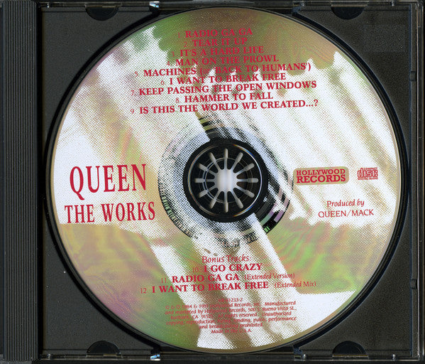 Original album originally released in 1984 This release has no mention of 20 Queen Years series inside booklet or back cover inlay. This issue has a black rectangular Hollywood Records logo left side on the back cover inlay. Remastered At: Future Disc Systems, Hollywood. Produced at the Record Plant, Los Angeles, California, USA and Musicland Studios, Munich, Germany. August 83-January 84. All Lyrics © 1984 except "I Go Crazy" © 1983. Used by permission. Published by Queen Music Ltd. Administered by Beechwood Music Corp. (BMI) © & ℗ 1984 & 1991 Hollywood Records, Inc. Manufactured and marketed by Hollywood Records Printed in U.S.A.