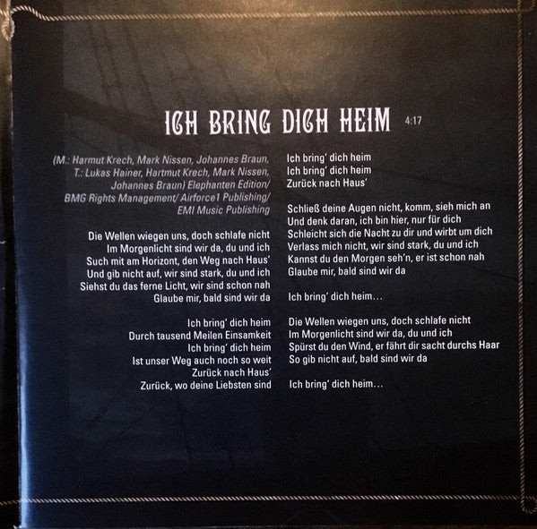 Santiano is: Björn Both, Hans-Timm Hinrichsen (Timsen), Pete Sage, Axel Stosberg, Andreas Fahnert. ℗ 2017 Snatiano GdR, under exclusive license to We Love Music, distributed by Electrola, a division of Universal Music GmbH © 2017 Electrola, a division of Universal Music GmbH, Ganghoferstraße 66, 80339 München. Made in the EU Some copies have an additional Inlet (2 Pages) with dates of the 2018 live tour.