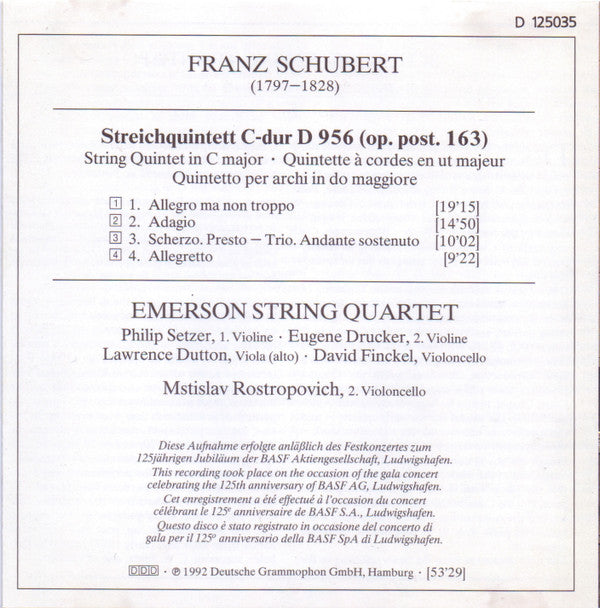 Recording: Speyer, Dreifaltigkeitskirsche, 12/1990 Philip Setzer wishes to thank Dr. William Sloan for the loan of the "Ex-Jackson" Stradivarius (Cremona, 1714) Recorded using B&W Loudspeakers ℗ 1992 Deutsche Grammophon GmbH, Hamburg © Prof. Martin Chusid, Dr. Hans Günter Klein, Laetitia Chassain-Ogliastri, Prof. Dr. Giovanni Carli Ballola Franz Schubert: Lithograph by Kreihuber • Historisches Museum der Stadt Wien Manufactured and Marketed by PolyGram Classics & Jazz, a Division of PolyGram Records, Inc., New York, N.Y. Total time: [53'29 Mfd. for BMG Direct Marketing, Inc. under License 6550 East 30th Street Indianapolis, Indiana 46219