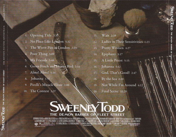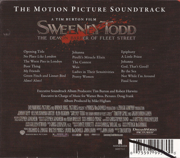 Deluxe Package: Complete soundtrack and 80-page color booklet (contains pictures, lyrics, credits and a short biography of Stephen Sondheim). Orchestra recorded at Air Lyndhurst Studios, London. Vocals recorded at Out of Eden, London. Mixed at Out of Eden, London. Mastered at Gateway Mastering & DVD, Portland, ME. Laura Michelle Kelly appears courtesy of [l26126/[l7505 Motion Picture Artwork and Photography © 2007 DreamWorks LLC and Warner Bros. Entertainment Inc. ℗ 2007 Nonesuch Records Inc. for the United States and WEA International Inc. for the world outside of the United States. Nonesuch Records Inc., a Warner Music Group Company, 1290 Avenue of the Americas, New York, NY 10104. Made in the U.S.A.