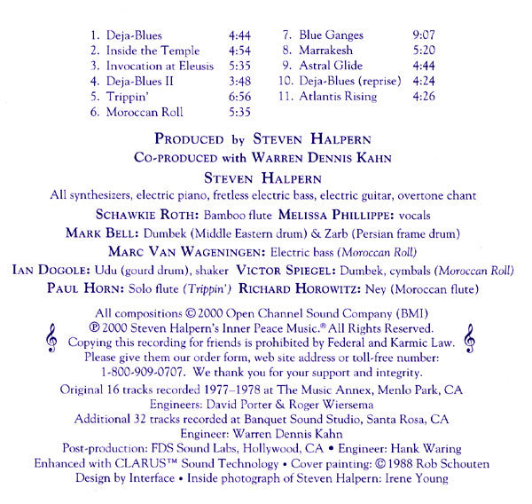Original 16 tracks recorded 1977 to 1978 at The Music Annex, Menlo Park, CA. Additional 32 tracks recorded at Banquet Sound Studio, Santa Rosa, CA. Post-production: FDS Sound Labs, Hollywood, CA. Enhanced with CLARUS(TM) Sound Technology. Cover painting: © 1988 © 2000 Open Channel Sound Company (BMI) ℗ 2000 Steven Halpern's Inner Peace Music