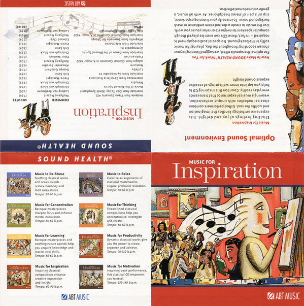 Issued in a transparent jewel case with a folded front insert wich appears as four pages (outer) and as one large page (inner). "Classical melodies with unique orchestration" On front insert: - All music © (P) 1998 ABT Music, a division of Advanced Brain Technologies, LCC - © 2004 ABT Music On disc: - © 2003 ABT Music - All music © (P) 2003 ABT Music, a division of Advanced Brain Technologies, LCC - Manufactured in USA On Traycard: © 2003 ABT Music