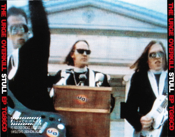 The spine gives the full title as "The Urge Overkill Stull EP". Track 3 is a cover of "Stitches In My Head" by The Alan Milman Sect Tracks 4 and 5 were previously available through the Sub Pop Singles Club as SP 109. Produced at Noise New Jersey. Publishing 1: Tallyrand Music BMI 2, 4 to 6: King/Kato, Ltd. BMI. © 1992 Urge Overkill ℗ 1992 Touch And Go Records. Disc: Made in Canada Printed on rear insert: Printed in Canada Clear/white sticker on back of jewel case: Made in Canada Issued in standard jewel case with front and rear inserts, black disc tray.