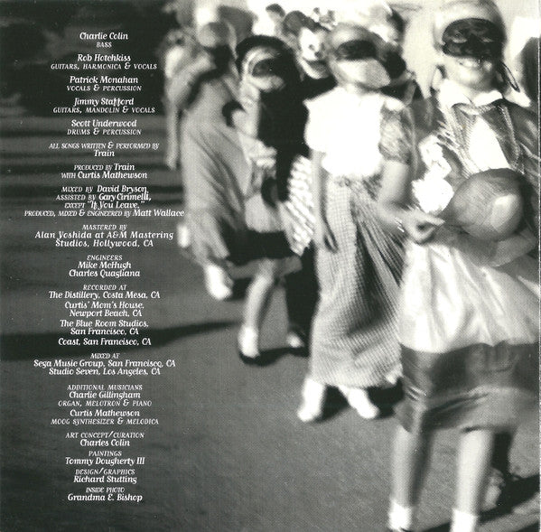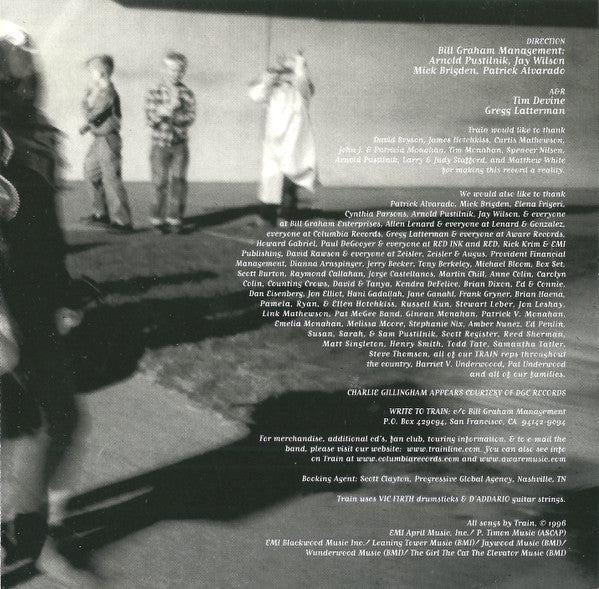 Tracks 12 and 13 are unlisted bonus tracks. © & ℗ 1998 Sony Music Entertainment Inc. Manufactured by Columbia Records / Distributed by Red / Marketed by Red Ink WK 38052 unbreakable stereo CTDP 001630 Mastered at A&M Mastering Studios, Hollywood, CA Recorded at: - The Distillery, Costa Mesa, CA - Curtis' Moms House, Newport Beach, CA - The Blue Room Studios, San Francisco, CA - Coast, San Francisco, CA Mixed At: Sega Music Group, San Francisco, CA & Studio Seven, Los Angeles, CA [a294697 appears courtesy of [l165962 All songs by Train ℗ 1998 EMI April Music Inc./P.Timon Music (ASCAP) EMI Blackwood Music Inc./Leaning Tower Music (BMI)/Jaywood Music (BMI)/Wunderwood Music (BMI)/The Girl The Cat The Elevator Music (BMI) Released in a standard jewel case with clear CD tray and a 4-page booklet with photos and credits.