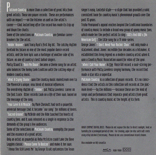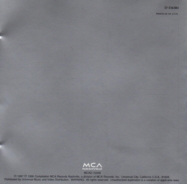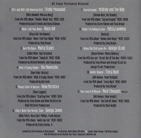 1 From the MCA album "240324" MCAC-11201 2 From the MCA album "336549" MCAC-42321 3 From the MCA album "622475" MCAC-10106 4 From the MCA album "455584" MCAC-10961 5 Produced for Reba McEntire Productions, From the MCA album "[m603939" MCAC-11264 6 From the MCA album "780375" MCAC-10652 7 From the MCA album "295652" MCAC-10540 8 From the MCA album "479134" MCAC-42223 9 Produced for George Strait Productions, From the MCA box set "915161" MCAC4-11263 10 From the MCA album "856024" MCAC-10649 11 From the MCA album "624831" MCAC-10032