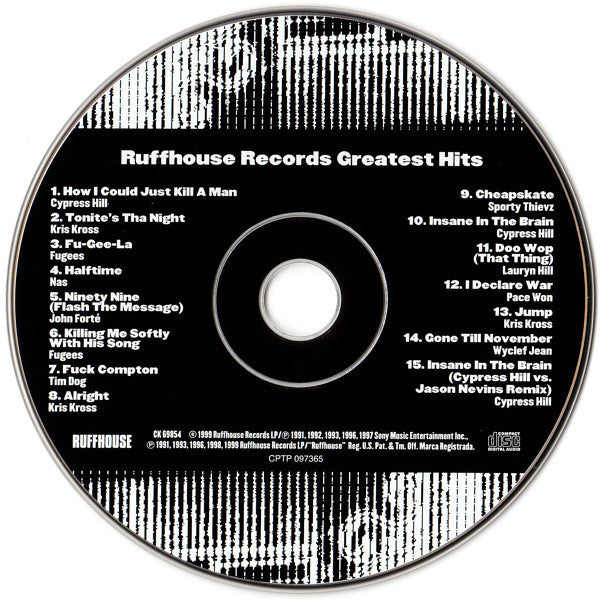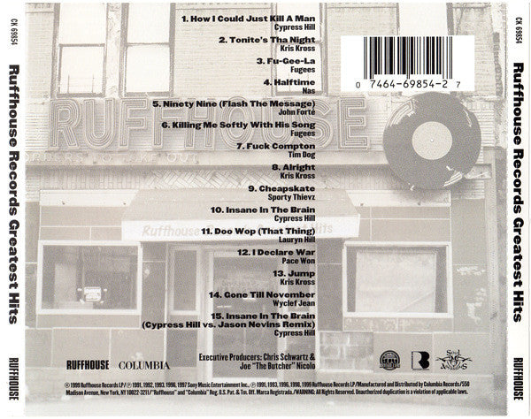 Track 1: Produced, arranged and mixed for Soul Assassins. Engineered and mixed at Studio 4 Recording, Philadelphia, PA. Recording engineered at Image Recording, Los Angeles, CA. Contains elements from "Tramp". Powerforce Music/Budget Music (BMI). Performed by Tramp. Cypress Hill Music/BMG Songs (ASCAP)/MCA Music, div. of MCA/Powerforce Music/Budget Music. ℗ 1991 Sony Music Entertainment Inc. Track 2: Produced for So So Def Productions. Recorded at Krosswire Studio, Atlanta, GA. Mixed at Studio Lacoco, Atlanta, GA. Contains a portion of "Riding High" Globeart Publishing o/b/o Montezk Music (BMI), Play One Music Publishing (admin. by Rightsong Music Inc.) (BMI). So So Def Music (ASCAP)/EMI April Music, Inc. (ASCAP)/GlobeArt Publishing on behalf of Montezk Music (BMI)/Play One Music Publishing admin. by Rightsong Music Inc. (BMI). ℗ 1996 Ruffhouse Records LP. Track 3: Produced for Dashiki Productions, Inc. Recorded and mixed at The Crib, NYC. Contains a replayed sample from "Ooh La La La" McNella Music/Midnight Music (ASCAP). Sony/ATV Tunes LLC/Tete San Ko Publishing (ASCAP)/Obverse Creation Music (ASCAP)/McNella Music (ASCAP)/Midnight Magnet Music/EMI April Music, Inc. (ASCAP) on behalf of itself and Salaam Remi Music, Inc. (ASCAP). ℗ 1996 Sony Music Entertainment Inc. Track 4: Mixed at Studio 4, Philadelphia, PA. Recorded at Chung King Studios, NYC. EMI April Music, Inc./Zomba Enterprises (ASCAP)/Taking Care of Business (ASCAP). ℗ 1992 Sony Music Entertainment Inc. Track 5: Produced for R.C.E. Co-produced for R.C.E. Recorded at Chung King Studios, NYC. Mixed at Chung King Studios, NYC. Contains elements from "Mash It Up" Hit & Hold Music, Inc. (ASCAP). Performed by Just Ice. Contains resung elements from "Ninety Nine Luftballoons" EMI Songs Musikzerlag/Additìons Hate (admin. by EMI April Music, Inc.) (ASCAP). EMI Songs Musikverlag GmbH (GEMA) admin. by EMI April Music, Inc. (ASCAP)/Nutzbaby Music (ASCAP). ℗ 1998 Ruffhouse Records LP. Track 6: Produced for R.C.E. Co-produced for R.C.E. Recorded and mixed for Rikers Island Productions and R.C.E. at the Booga Basement Studios, South Orange, NJ. Fox-Gimble Productions, Inc. (BMI)/Sony/ATV Songs, LLC (BMI) on behalf of Rodali Music. ℗ 1996 Sony Music Entertainment Inc. Track 7: Produced for Brothers of Funk Productions. Tim Dog Music (BMI). ℗ 1991 Ruffhouse Records LP. Track 8: Produced for So So Def Productions. Mixed at Studio 4, Philadelphia, PA. Contains a sample from "Just A Touch Of Love" Cotillion Music, Inc and Spurtree Music. All rights administered by Warner-Tamerlane Publishing Corp. (BMI) as recorded by Slave. So So Def Music/EMI April Music, Inc. (ASCAP). ℗ 1993 Ruffhouse Records LP. Track 9: Produced for Roc-A-Blok Productions, Inc. Recorded at Roc-A-Blok Studios. Mixed at Sony Studios. Contains elements from "Life Is Just A Moment" Chrysalis Music Publishing/Ubiquity Music ASCAP. Performed by Roy Ayers. Copyright Control/Chrysalis Music/Ubiquity Music (ASCAP). ℗ 1998 Ruffhouse Records LP. Track 10: Produced, arranged and mixed for Soul Assassins. Engineered at 38 Fresh and Image Recording, Hollywood, CA. Mixed at Studio 4 Recording, Philadelphia, PA. BMG Songs, Inc./Cypress Funky Music/MCA Music Publishing, a div. of MCA Inc./Soul Assassins Music (ASCAP). ℗ 1993 Sony Music Entertainment Inc. Track 11: Produced, written, arranged and performed for Obverse Creations, Inc. Recorded at Marley Music, Inc., Kingston, Jamaica and Chung King Studios, NYC. Mixed at Sony Music Studios, NYC. Sony/ATV Tunes LLC (ASCAP)/Obverse Creation Music (ASCAP). ℗ 1998 Ruffhouse Records LP. Track 12: Produced for Roc-A-Blok Productions, Inc. Recorded and mixed at Unique Studios, NYC. Copyright Control/Biggie Music (BMI). ℗ 1999 Ruffhouse Records LP. Track 13: Produced for So So Def Productions. Mixed at Studio 4, Philadelphia, PA. So So Def Music (ASCAP). ℗ 1992 Sony Music Entertainment Inc. Track 14: Produced for R.C.E. Co-produced for R.C.E. Recorded and mixed at Chung King Studios, NYC. Symphony recorded at Manhattan Center. Sony/ATV Tunes (ASCAP)/Tete San Ko Publishing (ASCAP). ℗ 1997 Sony Music Entertainment Inc. Track 15: Produced, arranged and mixed for Nevco Productions Inc. BMG Songs, Inc./Cypress Funky Music/MCA Music Publishing, a div. of MCA Inc./Soul Assassins Music (ASCAP). ℗ 1993 Sony Music Entertainment Inc. © 1999 Ruffhouse Records LP. ℗ 1991, 1992, 1993, 1996, 1997 Sony Music Entertainment Inc. ℗ 1991, 1993, 1996, 1998, 1999 Ruffhouse Records LP. Issued in standard jewel case with grey color CD tray. Small custom sticker on front of jewel case. 2nd catalog number appears only on sticker. Duration not listed.