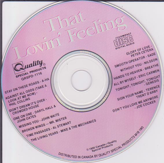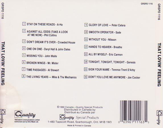 © 1990 Canada - Quality Special Products. Distributed in Canada by / Distibué au Canada par Quality Special Products. Track 2 "Phil Collins - Against All Odds (Take A Look At Me Now)" is a shorter edited version with the second half of the first verse excluded. This version does not seem to be available elsewhere. Most other tracks generally seem to be longer than single versions, but many are a lot shorter than album versions. Track durations compared to single and album versions: Track 1: 4:46 (single version: 4:46 / album version: 4:46) Track 2: 3:02 (single version: 3:24 / album version: 3:23) Track 3: 3:56 (single version: 4:03 / album version: 4:03) Track 4: 4:18 (single version: 3:53 / album version: 4:28) Track 5: 4:27 (single version: 3:58 / album version: 4:45) Track 6: 4:38 (single version: 4:28 / album version: 5:45) Track 7: 4:26 (single version: 4:35 / album version: 6:39) Track 8: 5:03 (single version: 4:25 [Edit / album version: 5:32) Track 9: 4:24 (single version: 4:20 / album version: 4:56) Track 10: 4:24 (single version: 4:15 / album version: 4:58) Track 11: 3:13 (single version: 3:17 / album version: 3:17) Track 12: 4:19 (single version: 4:17 / album version: 4:17) Track 13: 4:54 (single version: 4:22 / album version: 7:13) Track 14: 4:39 (single version: 4:32 [Edit / album version: 8:53) Track 15: 4:37 (single version: 4:35 / album version: 4:38 / 4:45) Track 16: 4:40 (single version: 4:00 / album version: 5:21) Glass master date: October 25, 1991