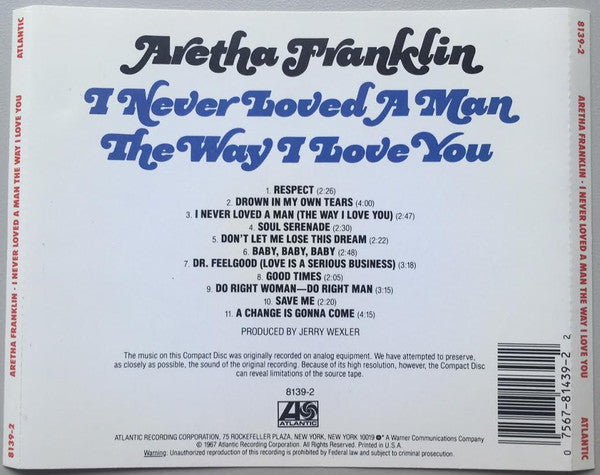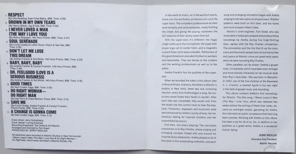© 1967 Atlantic Recording Corporation. All rights reserved. Printed in U.S.A. All selections were recorded at Atlantic Studios in New York except "I Never Loved A Man (The Way I Love You)" & "Do Right Woman - Do Right Man," which were recorded in Muscle Shoals, Ala. Publishing Information: Track 1 published by East-Time-Walco, BMI. Track 2 published by Jay & Cee, BMI. Tracks 3, 5, 6, and 7 published by 14th Hour-Pronto, BMI. Track 4 published by Kilynn & Vee-Vee, BMI. Tracks 8 and 11 published by Kags, BMI. Track 9 published by Press, BMI. Track 10 published by Kilynn-Pronto, BMI.