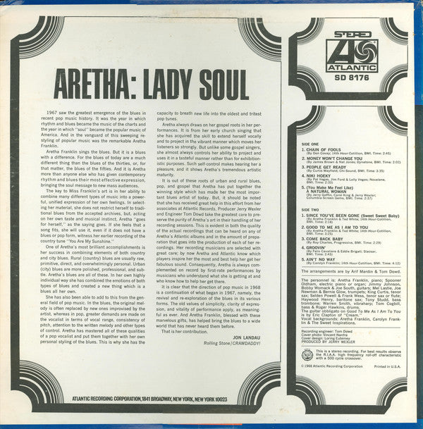 "CT" in label matrix & runout groove denotes [l403953 pressing. © 1968 Atlantic Recording Corporation Printed in U.S.A. Printed on the bottom on the back sleeve: Atlantic Recording Corporation, 1841 Broadway, New York, New York 10023 This pressing is on the green/blue label and is the one of the first pressings of this LP. Later during 1968 Atlantic changed to the green/orange label. Some copies have a sticker on the front with: Contains Her Latest Hit Singles Since You've Been Gone (Sweet, Sweet Baby) and Chain Of Fools M/SD 8176 Published by: 14th Hour-Cotillion (A1, B1, B2, B5) Dynatone (A2) Chi-Sound (A3) Novalene (A4) Columbia-Screen Gems (A5) Progressive (B3) Slacsar (B4)
