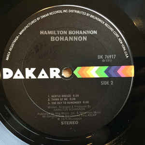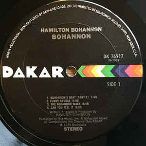 This album is dedicated to 'Dr. Feelgood' (the #1 early bird disc jockey of WAOK, Atlanta, GA., who has the influence and vibration to groove the young, and the medicine to rock the old.) Back sleeve and record are credited as Hamilton Bohannon, front cover as Bohannon ℗ 1975 Brunswick Arrowhead logo is full-width on this pressing.