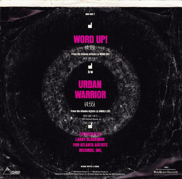 Track A: T-Man Publishing / Larry Junior Music (BMI) / All Seeing Eye Music (ASCAP) Track B: All Seeing Eye Music (ASCAP) / Larry Junior Music (BMI) Track A: ℗ 1986 PolyGram Records, Inc. Track B: ℗ 1985 PolyGram Records, Inc. © 1986 PolyGram Records, Inc. Produced for Atlanta Artists Records, Inc. Manufactured and Marketed by PolyGram Records, Inc., 810 Seventh Avenue, New York, New York, 10019 Printed in U.S.A. Track A: From the Atlanta Artists LP #422-830 265-1 M-1 "Word Up" Track B: From the Atlanta Artists LP #422-824 546-1 M-1 "Single Life" The main title is printed as "Word Up!" (on front and back cover) and "Word Up" (on label side A). Also released with different labels (different publishers) and same catalog number.