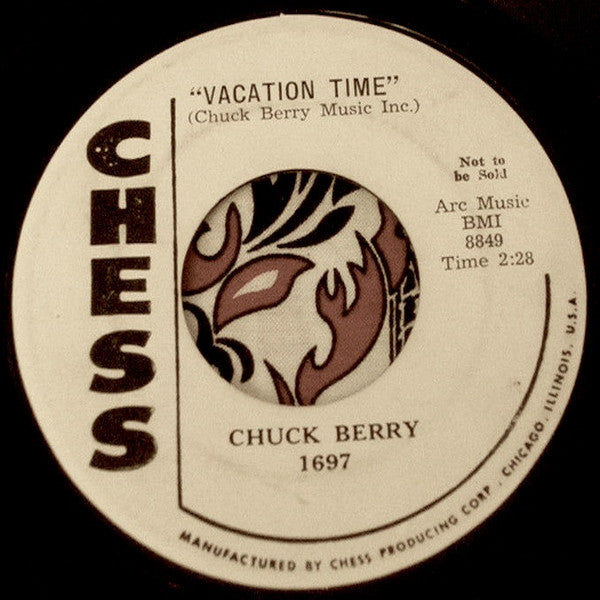 White label promo, "Not to be Sold" (no quotes) at upper right of label. "Chuck Berry Music Inc." under song title on both sides (as writer?). Both songs published by Arc Music BMI Rim text: Manufactured by Chess Producing Corp., Chicago, Illinois, U.S.A. (in all caps)
