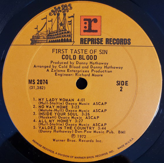 ℗ © 1972 Warner Bros. Records Inc. First Pitman Pressing, variant of this version, which also shows no "Stereo" or [l552180 rim text. A Zalamo Enterprises Production Recorded at Wally Heider Studios, Los Angeles and San Francisco Publishers: A1 - Dana Pub. Co. A2 - Country Road Music/Blackwood Music, Inc. A4, B5 - Don-Pow Music Pub. All other selections - Oxaca Music [a9746 appears courtesy of [l3820 [a363549 appears courtesy of [l1000 1st catalog #: labels/liner/spine; 2nd: cover