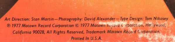PRC, Compton, pressing. Produced for Gwen Glenn Production Co. Recorded at ABC Studios, Burbank Studios, Paramount, Technisonic-St. Louis & United/Western Studios Mastered at Motown Recording Studios Published by A1, A2: Jobete Music Co. (ASCAP) A3, A4, B2: Old Brompton Road (ASCAP) B1: Jobete Music Co. (ASCAP) / Stone Diamond Music Corp. (BMI) B3, B4: Derglenn Music Publishing (BMI) B5: Old Brompton Road (ASCAP) / Derglenn Music Publishing (BMI) ℗ © 1977 Motown Record Corporation Printed in U.S.A. --------------------------------------------------------------------------------------------------------------------- Same US release than this two others: [r4479489 / [r782690, but with a slightly different label (see pictures!).