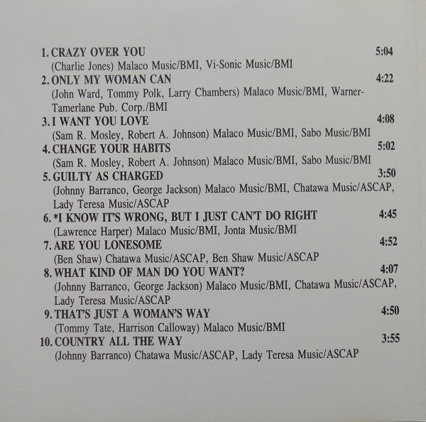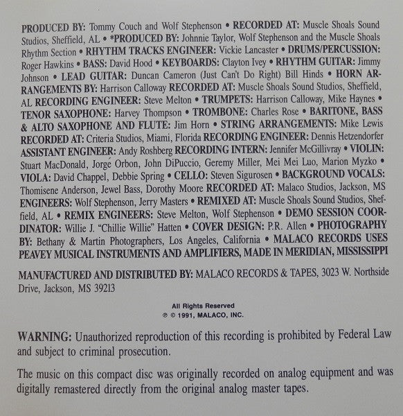 ℗© 1991, Malaco, Inc. Recorded at [Rhythm, Horns, Backing Vocals: Muscle Shoals Sound Studios, Sheffield, AL. Recorded at [Strings: Criteria Studios, Miami, Florida. Recorded at [Backing Vocals: Malaco Studios, Jackson, MS Remixed at Muscle Shoals Sound Studios, Sheffield, AL. Malaco Records uses Peavey Musical Instruments and Amplifiers, made in Meridian, Mississippi.