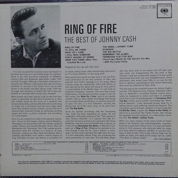 Two "T"s stamped on opposing sides of runout on side B, indicating Terre Haute Pressing Plant. First pressing with "Guaranteed High Fidelity" in black at bottom of labels. "3" added on the lower right of back cover, just after "© Columbia Records 1963/All Rights Reserved". Publishing: A1 - Painted Desert Music Corp. (BMI) A2 to A5 - Johnny Cash Music, Inc. (BMI) B1 - M. Witmark & Sons, Inc. (ASCAP) B2 - Livingston & Evans, Inc. (ASCAP) B3 - Johnny Cash Music, Inc. (BMI) B4 - Vidor Pub. (BMI) B5 - Johnny Cash Music, Inc. (BMI) B6 - Hill & Range Songs, Inc. (BMI) ® "Columbia". Marcus Reg. Printed in U.S.A. © Columbia Records 1963/All Rights Reserved