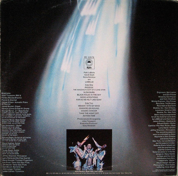 Recorded at Sea-Saint Studios, Inc., New Orleans, Louisiana. Mixed At CBS Studios, Inc., New York. Basic song arrangements for all the material were done by LABELLE and their band. ℗ 1975 CBS, Inc. © 1975 CBS, Inc. Manufactured by Epic Records. All songs except A5 Copyright © 1975 Gospel Birds, Inc. (BMI) A5 Copyright © 1973 Stone Diamond Music Corp. (BMI) / Tannyboy Music (BMI) / Kenny Nolan Publishing (ASCAP) Hollywood, California. Allain Toussaint & The Meters courtesy of Warner Brothers Records. Issued with a printed inner sleeve. Both front and back cover artwork is rotated 90 degrees clockwise compared to spine and opening. Thus spine is placed at bottom of front cover artwork, at top of back cover artwork. re: runouts side B - unable to determine etched #, both # and B are etched with half on label and half in runout area