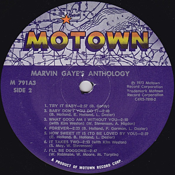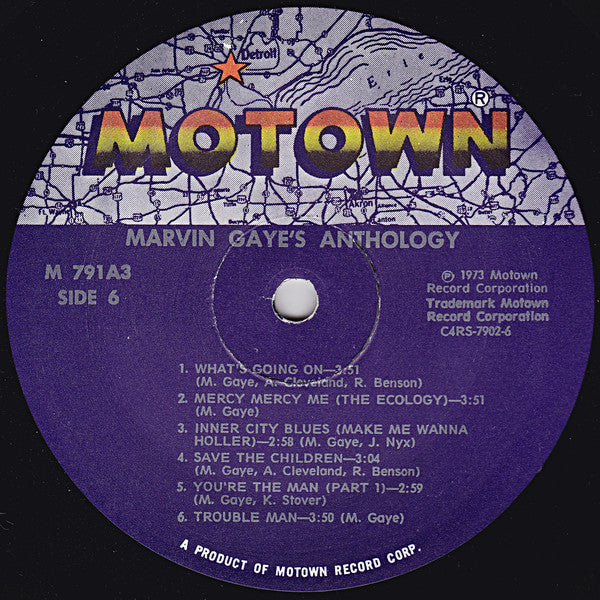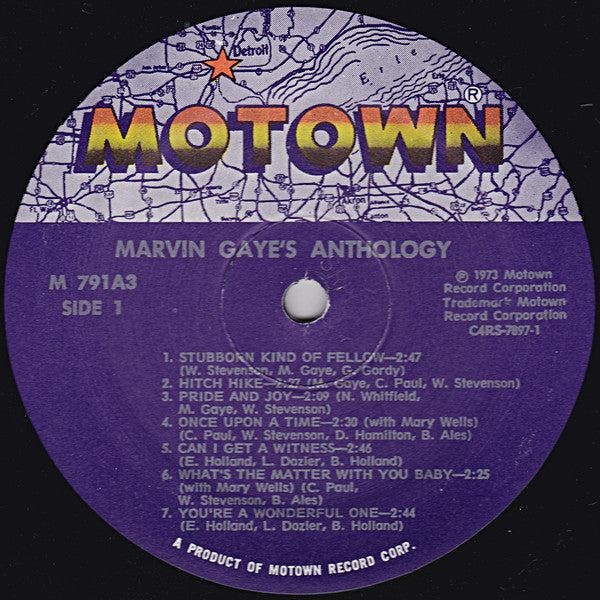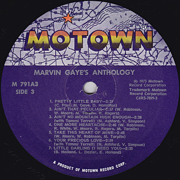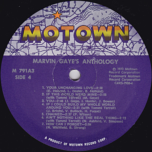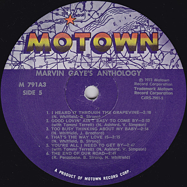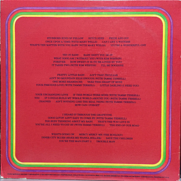 [=Superior Record Pressing Corp., Tempe, Arizona pressing denoted by "SRPCW" deboss near spindle holes. Trifold sleeve. Includes 12 page photo booklet (11.5"x11.5") 1970s reissue without barcode. Text at bottom of the labels reads "A Product of Motown Record Corp." like this version with different labels but unlike the barcode version M9 791A3 on jacket (front and spine). M 791A3 on record labels. Writer credits as on labels.