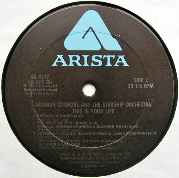 ℗ & © 1977 R.A. Inbow, Ltd. Norman Connors plays Gretsch drums exclusively, Latin percussion instruments and Paiste cymbals and gongs Main artist and title on front cover: Norman Connors - This Is Your Life Main artist and title on back cover: Norman Connors And The Starhip Orchestra Featuring Miss Eleanor Mills - This Is Your Life Main artist and title on labels: Norman Connors And The Starhip Orchestra - This Is Your Life