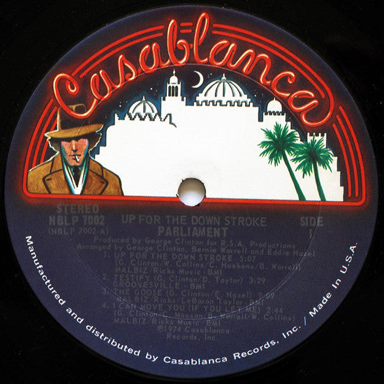Includes the shorter 3:29 mix of (A2) "Testify". An earlier pressing of Up For The Down Stroke includes a longer mix of 4:04 Label rim text says "Manufactured and Distributed by Casablanca Records, Inc / Made in U.S.A." Recorded at United Sound - Detroit, Crystal Sound Studios and Hollywood Sound - Los Angeles Mastered at Allen Zentz Mastering Design: Rod Dyer Inc.