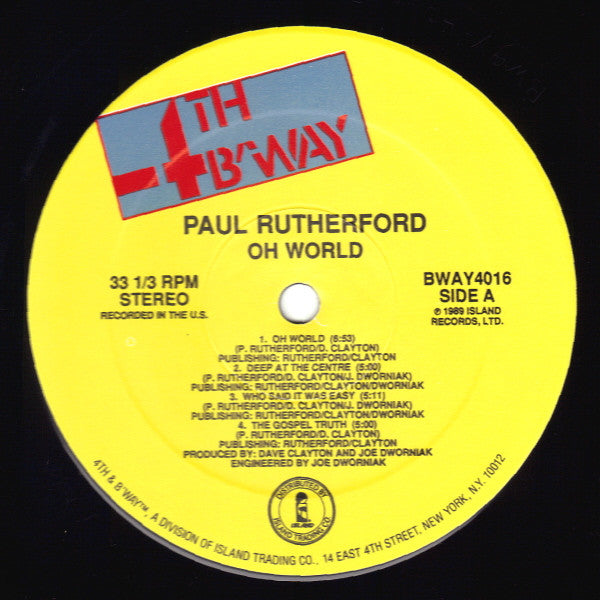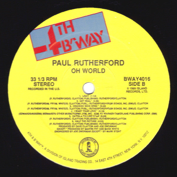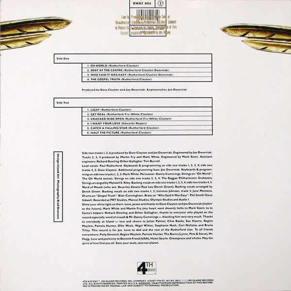 Recorded in the U.S. Recorded at PRT Studios, Marcus Studios, Olympic Studios and Audio I. Direct Metal Mastering Publishing: A1, A4, B1, B5, B6: Rutherford/Clayton A2. A3: Rutherford/Clayton/Dworniak B2, B3: Rutherford/Virgin Songs, Inc. (BMI)/D. Clayton B4: Bernard's Other Music / Tommy Jymi, Inc. Adm. by Warner-Tamerlane Publishing Corp. (BMI) [sleeve ℗ © 1989 Island Records Ltd. Printed in U.S.A. [labels ℗ 1989 Island Records, Ltd. Catalog # on spine, sticker, labels: BWAY4016 Catalog # on back of sleeve: BWAY 4016 Some issues may contain a custom sticker on sleeve. Sticker reads "Featuring The Single Oh World BWAY4016." Available on compact disc and cassette. Promotional copies issued with "Lent For Promotional Use Only" gold-stamped on back of sleeve.