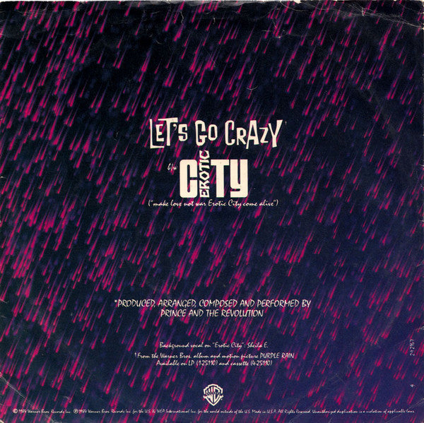Picture sleeve: 9 29216-7 Labels: 7-29216 ℗ 1984 Warner Bros. Records Inc. for the U.S. Side A, label: From the Warner Bros. album and motion picture PURPLE RAIN (1-25110) Side A, label: Controversy Music, ASCAP Similar editions: [r=8421172 (Jacksonville pressing) Let's Go Crazy / Erotic City (Winchester pressing) [this release [r=6013423 (ARC pressing) [r=577951 (SRC Pressing)