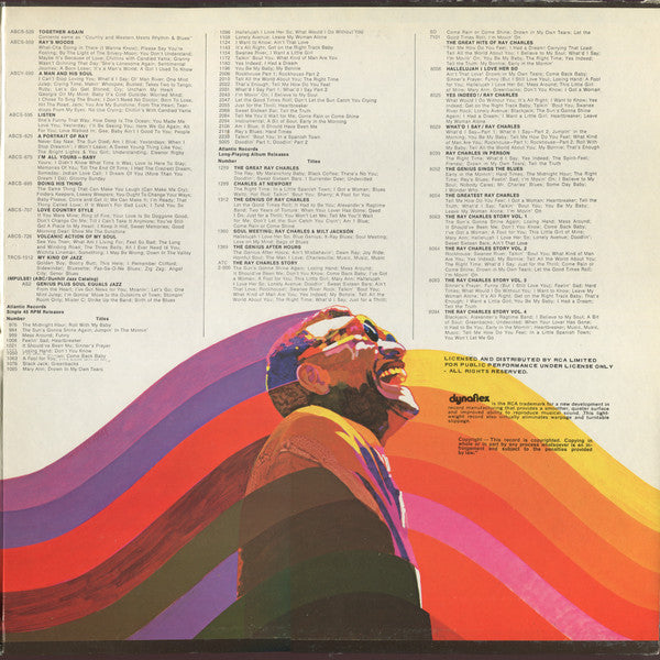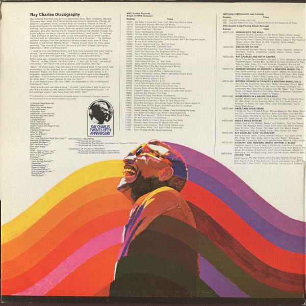 Gatefold sleeve. Sides are auto-coupled Inside gatefold features Ray Charles single and LP discography Record Set 36 Songs All Original Masters 25 Years of Recording History Ray Charles Twenty-Fifth Anniversary A1 to B9 Courtesy of Atlantic Records D8 Courtesy of Tangerine Records ©MCMLXXI All selections: Progressive Music Pub. Co., Inc. BMI except A7: Jay & Cee BMI B3: Crossroads Music Co. BMI B7: Leeds Music Co. ASCAP B8: Embassy Music Corp. BMI B9: Northern Music Corp. ASCAP C1, C7, C8: Peer Int'l Corp. BMI C2: Tee Pee Music Co. ASCAP C3, D6, D8: Tangerine Music BMI C5: Miller Music Corp. ASCAP C6: Acuff-Rose Pub. Inc. BMI C9: Pamper Music, Inc. BMI D1: Blue Book Pub. Co. BMI D2: Flamar Music, Inc. BMI D3, D5: Maclen Music, Inc. BMI D4: Metric Music Co. BMI D7 Racer United Artists Music ASCAP D9: Arc Music Corp. Playmate Music Co. BMI